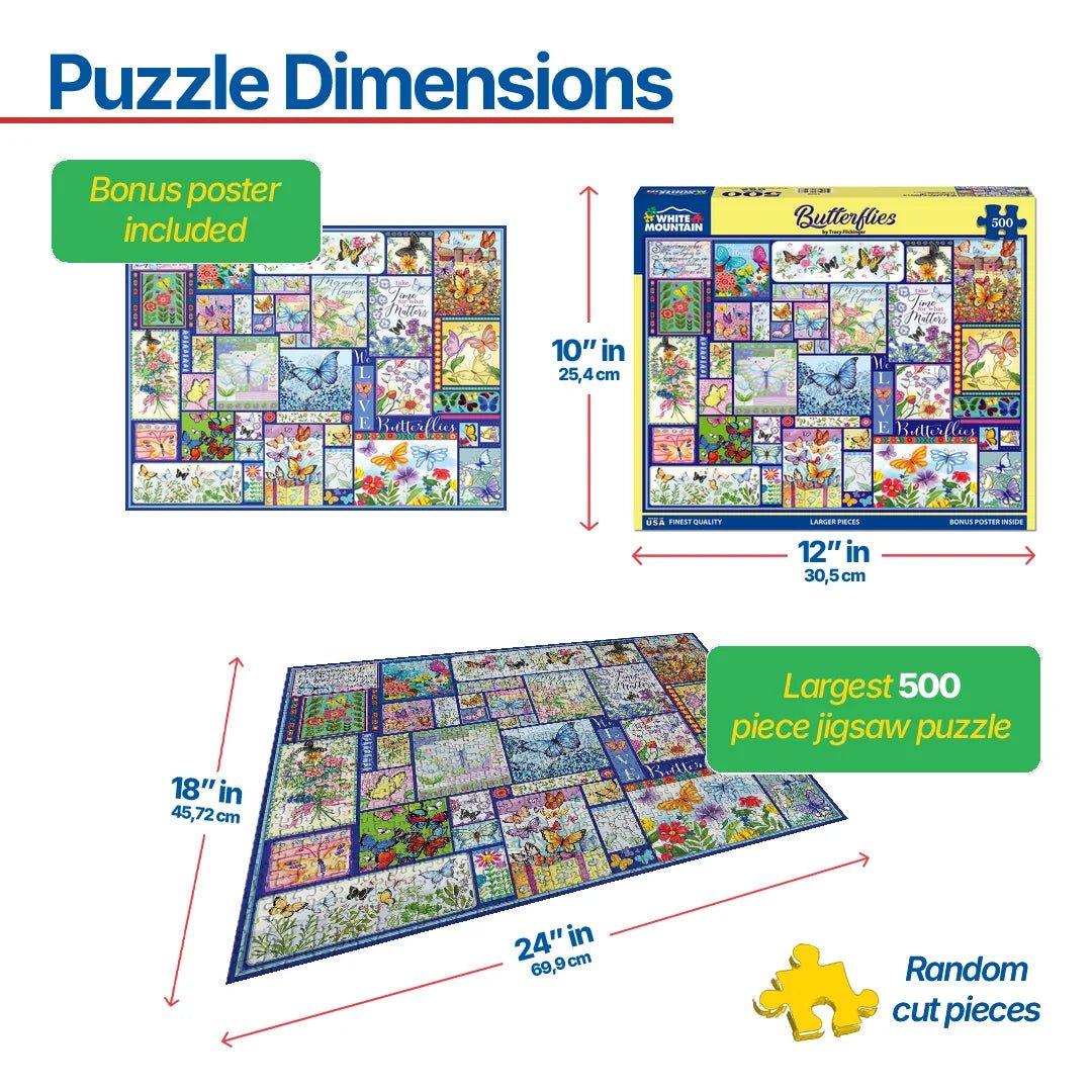 1930 Butterflies. Butterflies have different meanings for everyone. Whether you believe they symbolize, hope, love, positivity, or transformation we can all agree they are beautiful. With intricate patterned wings and brilliant colors, butterflies are said to be attracted to a kind soul and symbolize good luck in some cultures. Designer Tracy Flickinger assembled a collection of eye-catching butterflies and sayings that speak to the soul in this 500 piece collage style jigsaw puzzle. Finished size of 18” x 24”.