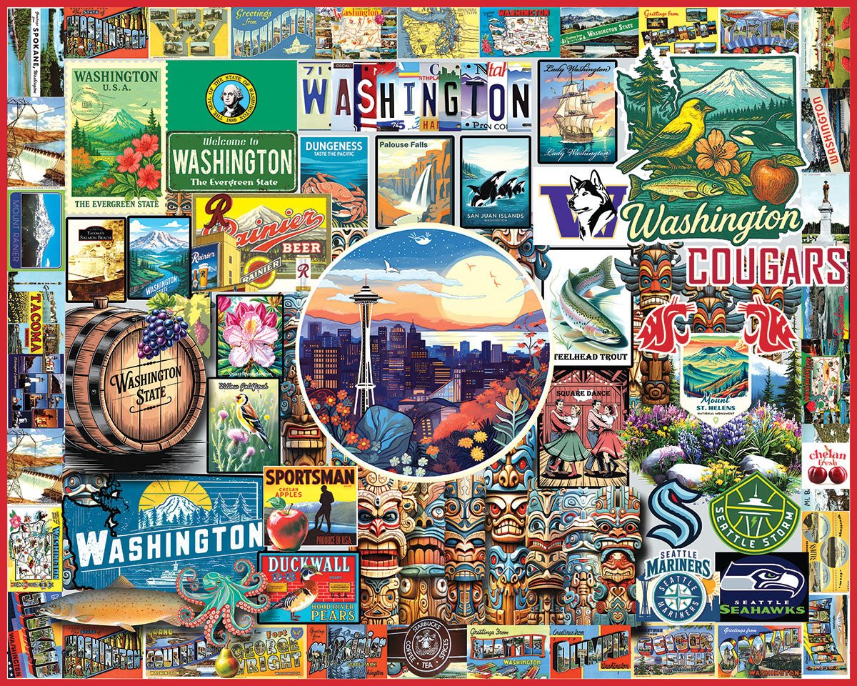 2127 I Love Washington. From the evergreen forests the snow-capped peaks to bustling city streets and quiet island harbors, this tribute to Washington State captures it all. Explore the patchwork of iconic landmarks, hometown pride, and natural wonders in this 1000 piece collage style jigsaw puzzle that captures the beauty and culture of the Pacific Northwest. Designed by Lois Sutton. Finished size 24" x 30".
