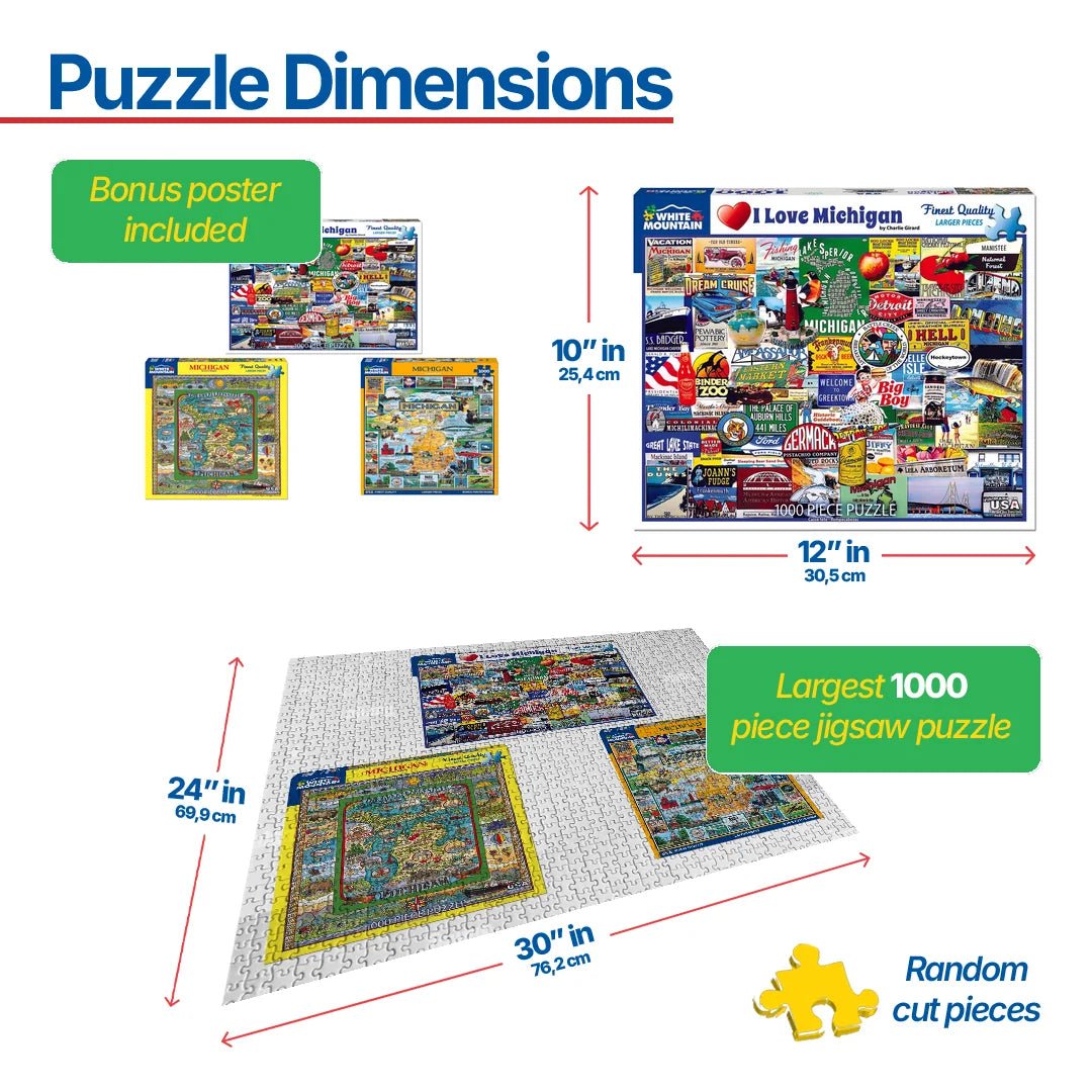 1221 I Love Michigan. The word Michigan is the French form of the Ojibwa word meaning "large water", so it's fitting that Michigan is known as "The Great Lakes State" among other titles. Its attractions abound on this colorful collage of advertisements by Charlie Girard, including the Leila Arboretum, Frankenmuth, the Gerald R. Ford Presidential Library & Museum, the National Cherry Festival in Traverse City, The Motor City (Detroit), the German Pistachio Company, Lake Superior, Lake Michigan, Lansing, Battle Creek, and Hell. 1,000 piece puzzle with a finished size of 24" x 30".