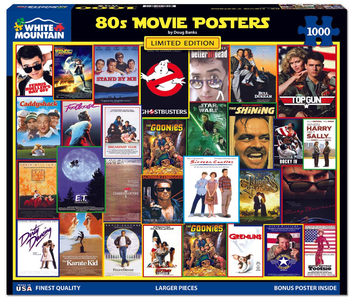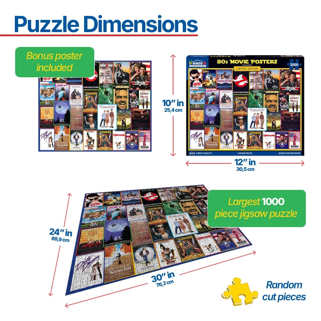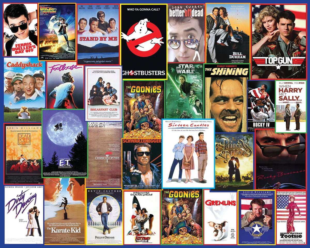 1990 80s Movie Posters. Its hard to believe these movie posters were originally created before digital design existed. Designed for marketing of films we would all watch over and over again, the vibrant colors and visual communication caught our attention. You knew you needed to see the movie before you knew what it was about. Designer Doug Banks created this Limited Edition 1000 piece collage style jigsaw puzzle to transport you back to the 80’s. Finished size 24" x 30".