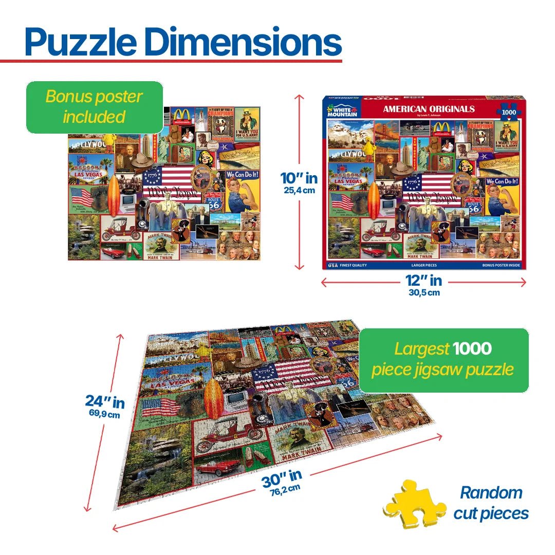 1866 American Originals. From the iconic Hollywood sign to a Frank Lloyd Wright original, Fallingwater, and The Founding Fathers to Elvis and Marilyn Monroe. Artist Lewis T. Johnson gathered important historical figures, events, locations, inventions, and companies that are uniquely American in this 1000 piece collage style jigsaw puzzle. Finished size 24" x 30".
