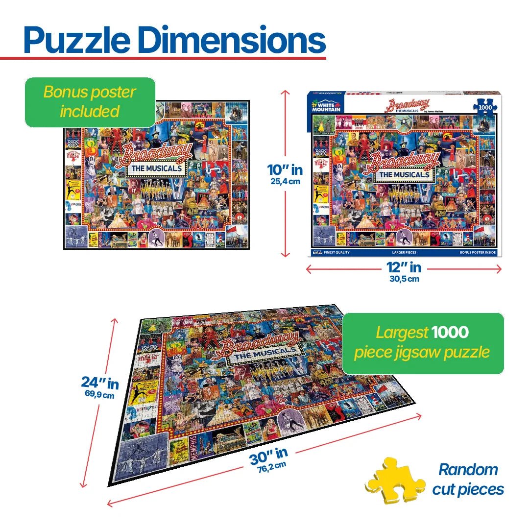 Broadway #1094 Artist Jim Mellett spent months painting this dazzling tribute to Broadway musicals. All the great shows are pictured here, including Rock of Ages, Thoroughly Modern Millie, Redhead, Hairspray, The Wiz, South Pacific, Memphis, Brigadoon, La Cage Aux Folles, Matilda, Kiss Me Kate, Seussical the Musical, Jersey Boys, Hair, Bye Bye Birdie, Billy Elliot, 42nd Street, Jesus Christ Superstar, Rent, Annie Get Your Gun, Mama Mia, Funny Girl, Camelot, Fiddler on the Roof, Cabaret, West Side Story, A Chorus Line, Oklahoma, Porgy & Bess, Phantom of the Opera, Springtime for Hitler, Godspell, Kinky Boots - and so many more for you to hum along to as you build this 1,000 piece puzzle.