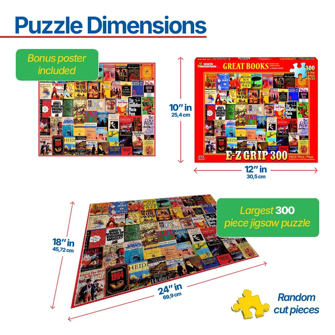 #1157 Great Books This Great Books puzzle should be required reading for old, young, and those in-between -- the "collected work" of artist Charlie Girard. Can you find your favorite best seller book covers in the puzzle? Images includes Oliver Twist, The Cat In The Hat, The Adventures Of Sherlock Holmes, To Kill A Mocking Bird, Treasure Island, Black Beauty, Stuart Little, The Catcher In The Rye, The Color Purple, The Secret Garden, The Great Gatsby, Gone with the Wind, The Godfather, Romeo & Juliet, and Charlotte's Web. 300 piece jigsaw puzzle: Finished size 18" x 24".