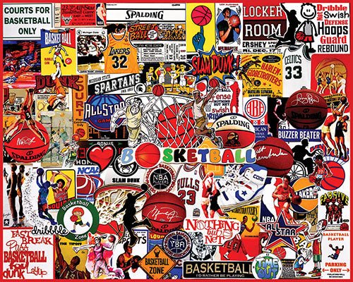 1772pz I Love Basketball. Calling all basketball fans. Artist Charlie Girard has gathered brands, moves, sayings, teams, and more in this 1000 piece collage style jigsaw puzzle. Finished size 24" x 30".