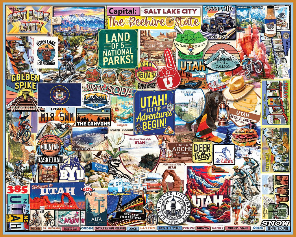 2083 I Love Utah. Having some of the tallest mountains in the country, the Beehive State also contains the largest natural rock span created by mother nature herself, Rainbow Bridge. The 45th state also boasts the largest collection of dinosaur bones and is a popular destination for outdoor enthusiast. Artist Lois Sutton brings the Utah’s natural beauty to you in this 1000 piece collage style jigsaw puzzle. Finished size 24" x 30".