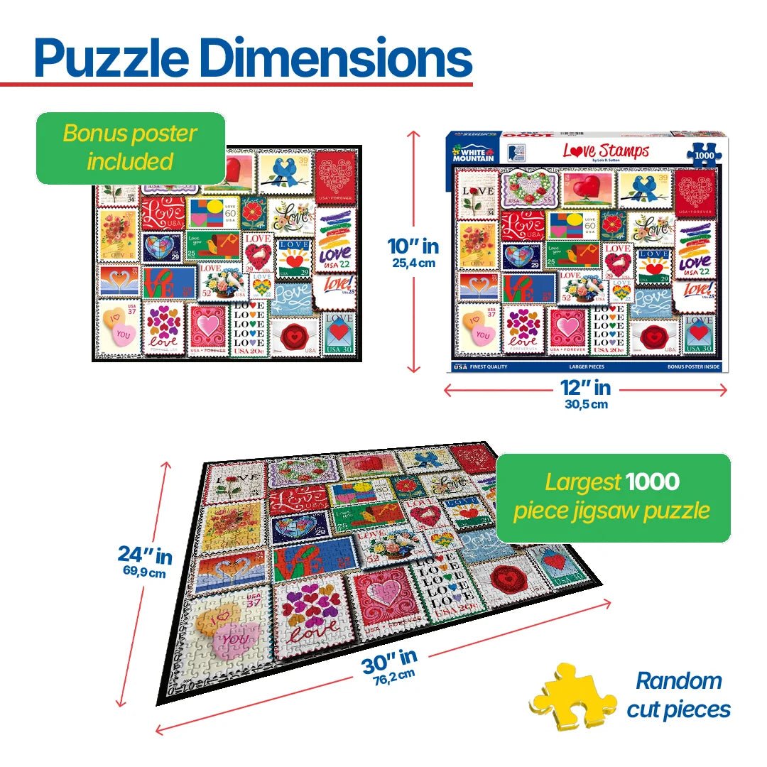 1510 Love Stamps. Love is in the air, love is on our minds and in our hearts, and love is in the U.S. Mail! Designer Lois B. Sutton has arranged this gorgeous collection of stamps going back to Robert Indiana's iconic LOVE graphic – issued in 1973 and only 8 cents! With a finished size of 24” x 30”, this puzzle has 1,000 pieces and 27 unique stamps.