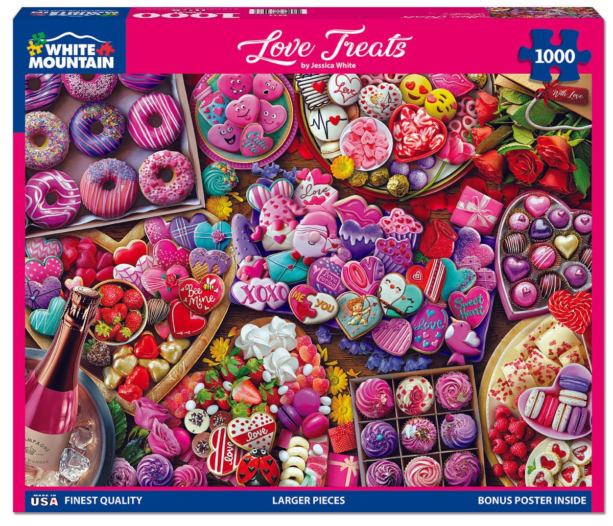 2044 Love Treats. Cupcakes, cookies, chocolate and more. Ā When stumped about what to give your love give them love treats. Artist Jessica White created this 1000 piece collage style jigsaw puzzle with love and an empty tummy in mind. Finished size 24" x 30".