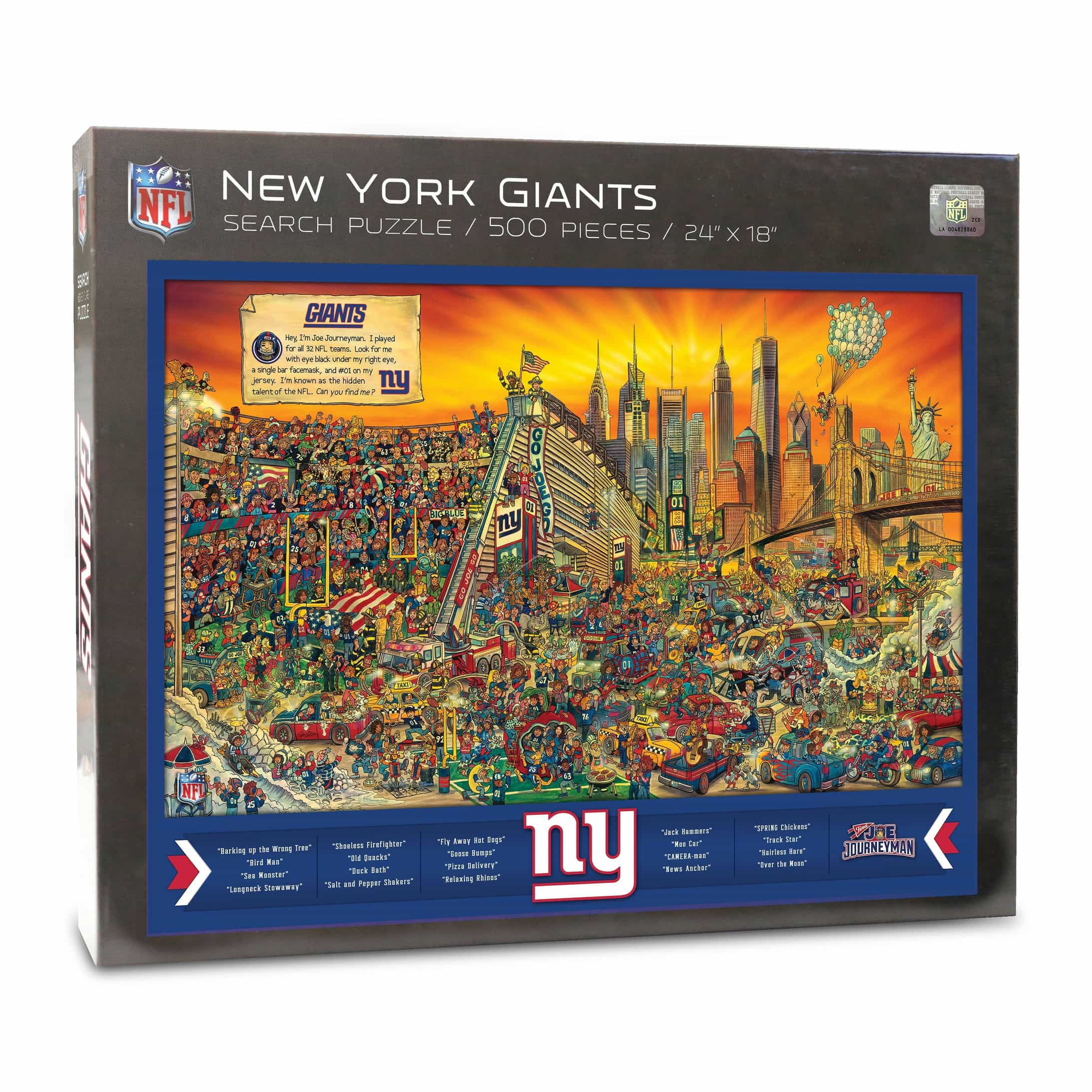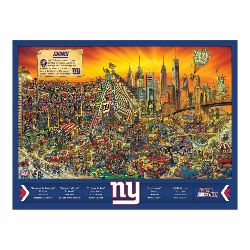 First you have to put the New York Giants puzzle together. Then you have to find Joe Journeyman - the only player to play for all 32 NFL teams - and discover dozens of laugh-out-loud scenes in these hand-drawn illustrations of NFL stadiums, their fans and their landmark surroundings. The Giants seek and find adventure puzzle is officially licensed by the NFL for use by Joe Journeyman, a YouTheFan brand.