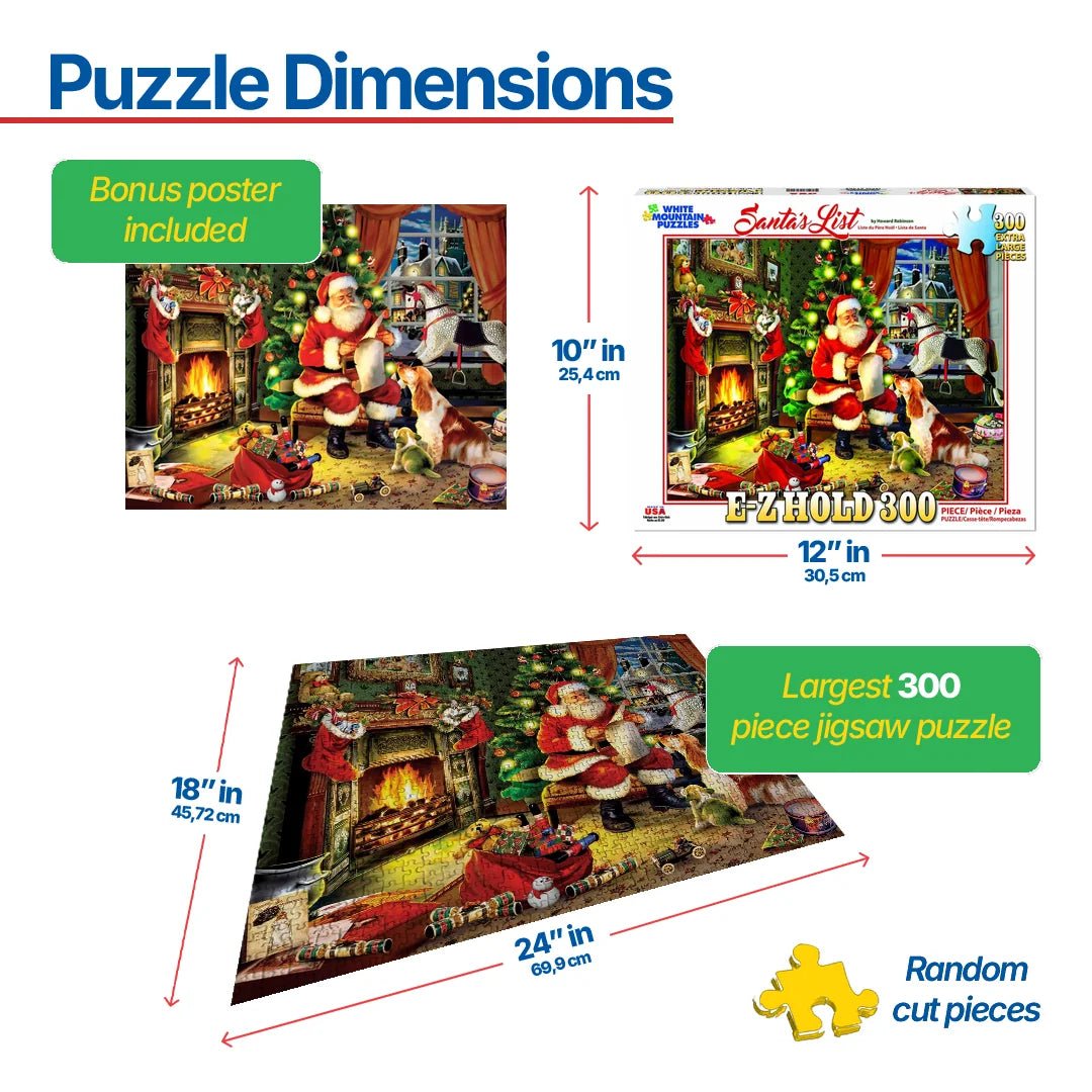 1302 Santa's List. This image has been a long-time favorite and we're excited to bring it to those of you who prefer extra large, easy-to-handle pieces in a smaller piece count. It still has all of artist Howard Robinson's wonderful detail , a blazing fire with pet portraits above the decorated mantel, more pets attentively watching as St. Nick checks his list, and a glimpse of village life through the window. 300 Piece Jigsaw Puzzle with a finished size of 18" x 24".