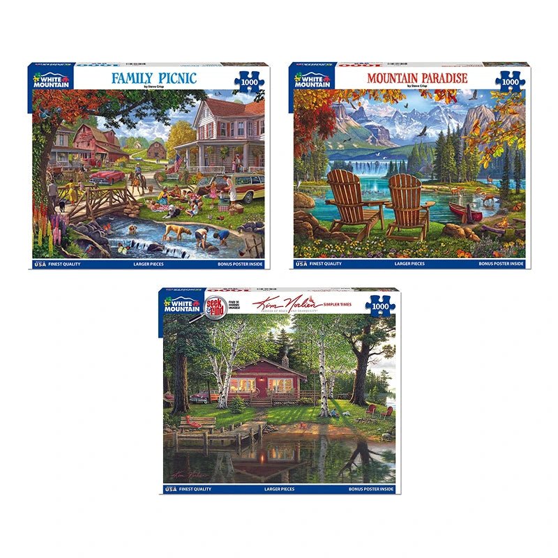 Simpler Times (Seek & Find). Calm has descended on the lake side cabin. A little girl reads her favorite book at the base of a tree with her furry friend at her side while her mom sits inside at the table. Designer Kim Norlien has hidden 10 images within this puzzle! The picture on the box offers a glimpse at a simpler time. A time to just relax and exist in and around nature. This 1,000 piece puzzle has additional items to make it even more fun to build! Fear not β there will be a cheat sheet inside to help you with your search. Finished size 24β x 30β.
