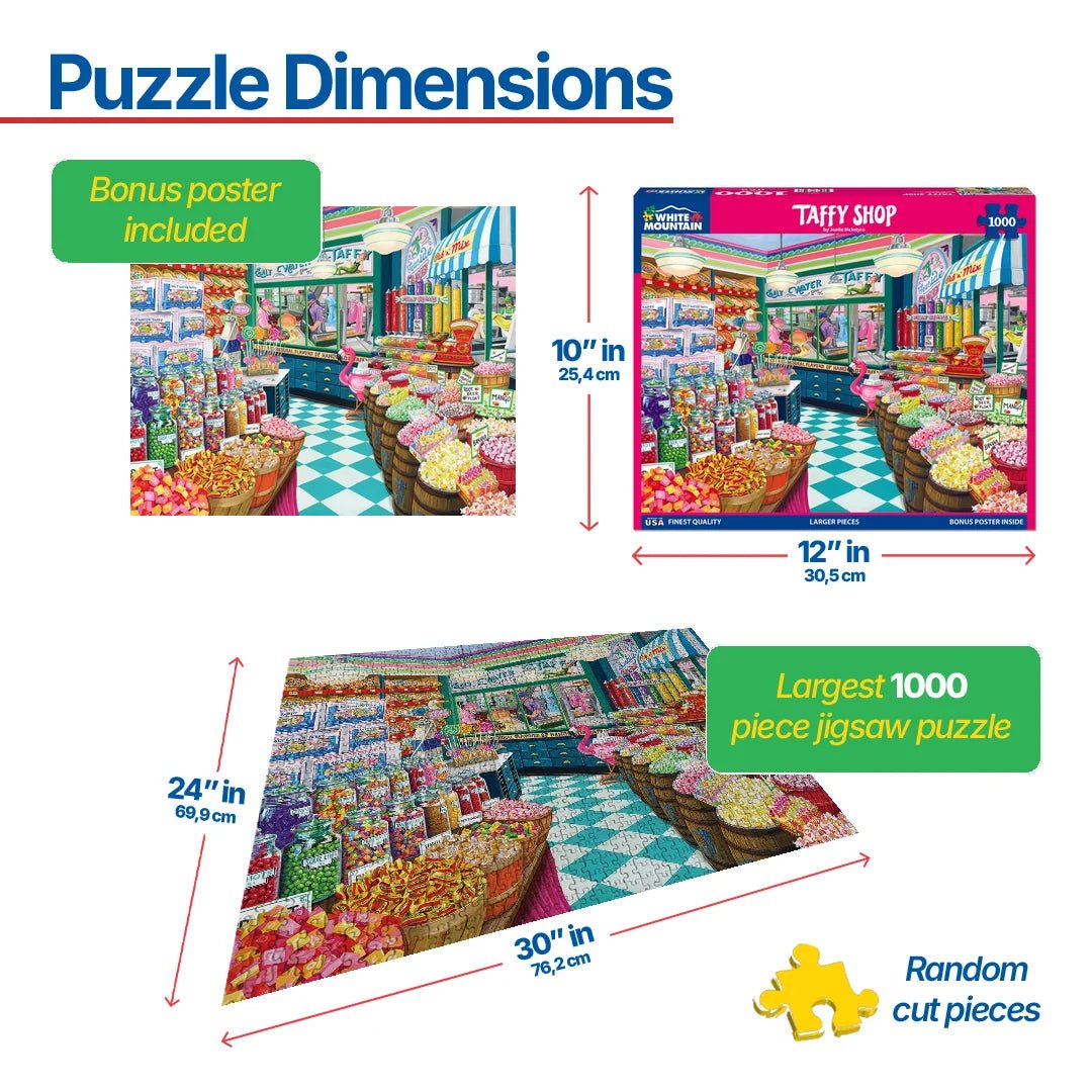2061 Taffy Shop. Bright colors and all the flavors you could desire and some you wouldn’t touch with a 10-foot pole can be found at the Taffy Shop. Jelly beans, lollipops, caramels and more. Choose a variety box or grab a bag of your favorites while you watch taffy bring pulled in front of you. If you’re lucky you may be able to get some freshly pulled and still warm. Artist Joelle McIntyre brings the boardwalk to you in this 1000 piece jigsaw puzzle. Finished size 24" x 30".