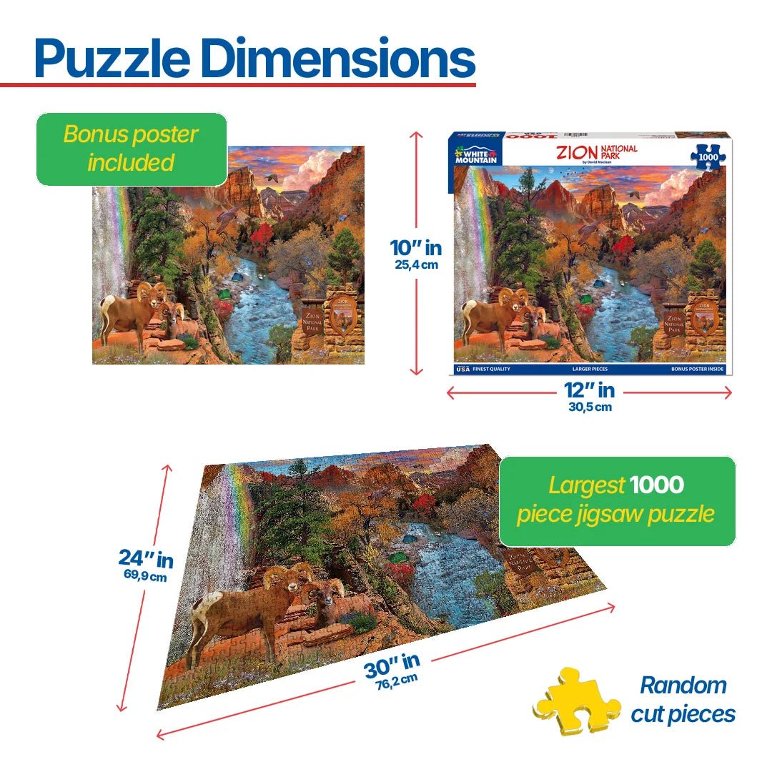 1940 Zion National Park. Some say the best time to visit Zion National Park is fall. The changing of the leaves is a beautiful contrast against the sandstone cliffs. From the waterfalls to the steep canyons, Zion is a place many wildlife call home. Birds soar overhead as bighorn sheep bask on top of a ledge in the sun. Artist David Maclean bring the beauty of sunset at Zion to you in this 1000 piece jigsaw puzzle. Finished size 24" x 30".